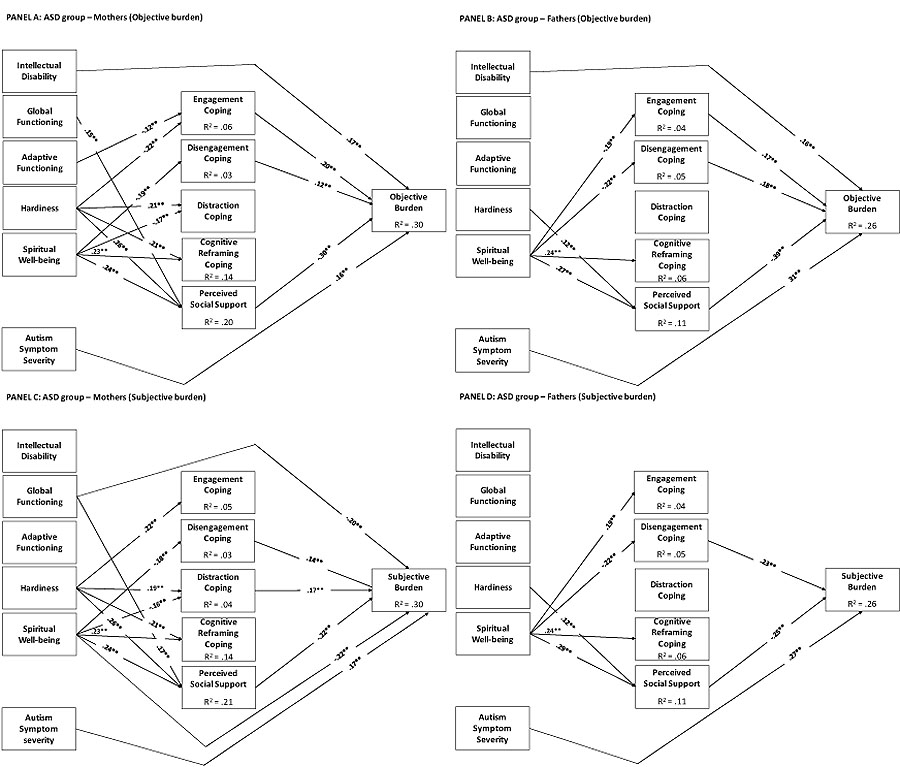 The parents of children with ASD reported higher objective and subjective burden, more frequent psychological distress, lower social support. Mothers reported greater subjective burden than fathers. Structural equation modeling showed that the most consistent positive and negative predictors of objective and subjective burden were ASD symptom severity and social support, respectively. Other positive predictors were engagement, distraction and disengagement coping, intellectual disability, and adaptive functioning. Other negative predictors were spiritual wellbeing and hardiness. Some effects were indirect through social support and coping strategies.