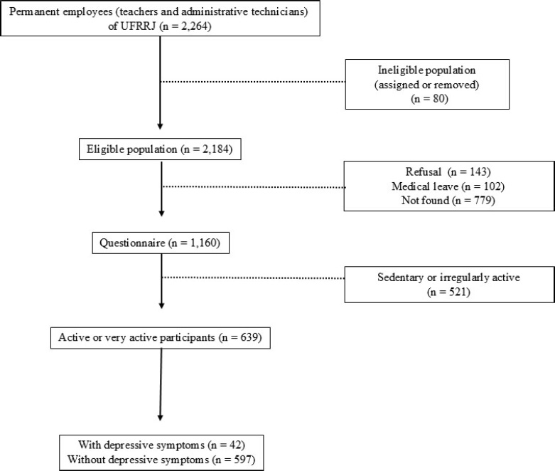 The first phase of the ELDAF study invited 2,264 permanent employees of the Rural Federal University of Rio de Janeiro, located in the city of Seropédica, state of Rio de Janeiro, Brazil, from September 2022 to December 2023. Of this total, 80 subjects were excluded because they were away from work, leaving 2,184 individuals. In addition, 143 subjects refused to participate in the study, 102 were on medical leave, and 779 could not be located. Thus, the ELDAF study managed to recruit a total of 1,160 individuals. Recruitment took place through advertisements and by email contact through a list provided by the institution. To be eligible, participants had to be classified as active or very active using the International Physical Activity Questionnaire (IPAQ) [18]. For the exposure group, participants were required to present a cutoff point of ≥ 9 for screening a major depressive episode, as determined by the “Patient Health Questionnaire” (PHQ-9) [19]. In addition, the following exclusion criteria were used: (a) assigned to another institution, (b) on leave, or (c) lacking the cognitive potential to respond to the data collection instruments. The study followed the guidelines established in the Declaration of Helsinki for human subjects. All subjects signed informed consent, and the experiment gained approval from the Research Ethics Committee of the Salgado of Oliveira University (protocol number: 4.082.122). Sex was determined based on self-report, with participants indicating whether they identified as male or female at the time of data collection. No biological or genetic testing was performed to verify chromosomal sex. Throughout this manuscript, the term “sex” refers to these self-reported categories, in accordance with the SAGER Guidelines. Data on gender identity were not collected in this study.