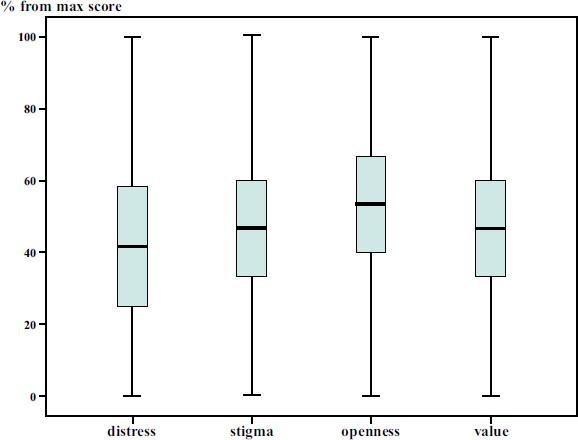 Percentages from the maximum score of distress, stigma, and attitudes (openness and value).
